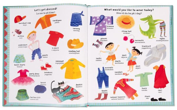 I denne innholdsrike ordboka får du følge en vennlig familie gjennom en travel hverdag. Du finner over 700 ord på engelsk og norsk, så her er mye å lære og dele. Barn i barnehagealder er ofte nysgjerrige på andre språk, og spesielt engelsk. Ordboka har et tydelig tema for hver dobbeltside, alt fra klær, mat, dyr og yrker til vær, byliv og transport.